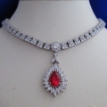 | アレクサンドラネックレス 【一点のみの限定ジュエリー】 ゴージャスでインパクトのあるジュエリー! 美しい色合いのルビーを 20石のマーキーズカットのダイヤで囲んだ 華やかなモチーフがトップに下がった 高貴な印象のネックレスです。 赤いドレスはもちろんですが、 黒や白のドレスにも似合いますので 応用範囲の広いジュエリーです。 パーティーや発表会などで 素敵なあなたを演出してみてください。 |