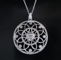 | ピオニーペンダント 大輪のお花が咲いたような美しく印象的なジュエリー! 丸いモチーフの中に小さな丸が組み合わされた スタイリッシュな幾何学模様が魅力的な デザインのペンダントです。 ステンドグラスのように美しいモチーフが 浮き上がって見えるデザインです。 チェーンは少し長めの43cmですが 6cmのアジャスター付きで最長49cmになりますので 変化をつけた楽しみ方ができます。 |