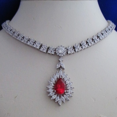ゴージャスでインパクトのあるジュエリー! 美しい色合いのルビーを 20石のマーキーズカットのダイヤで囲んだ 華やかなモチーフがトップに下がった 高貴な印象のネックレスです。